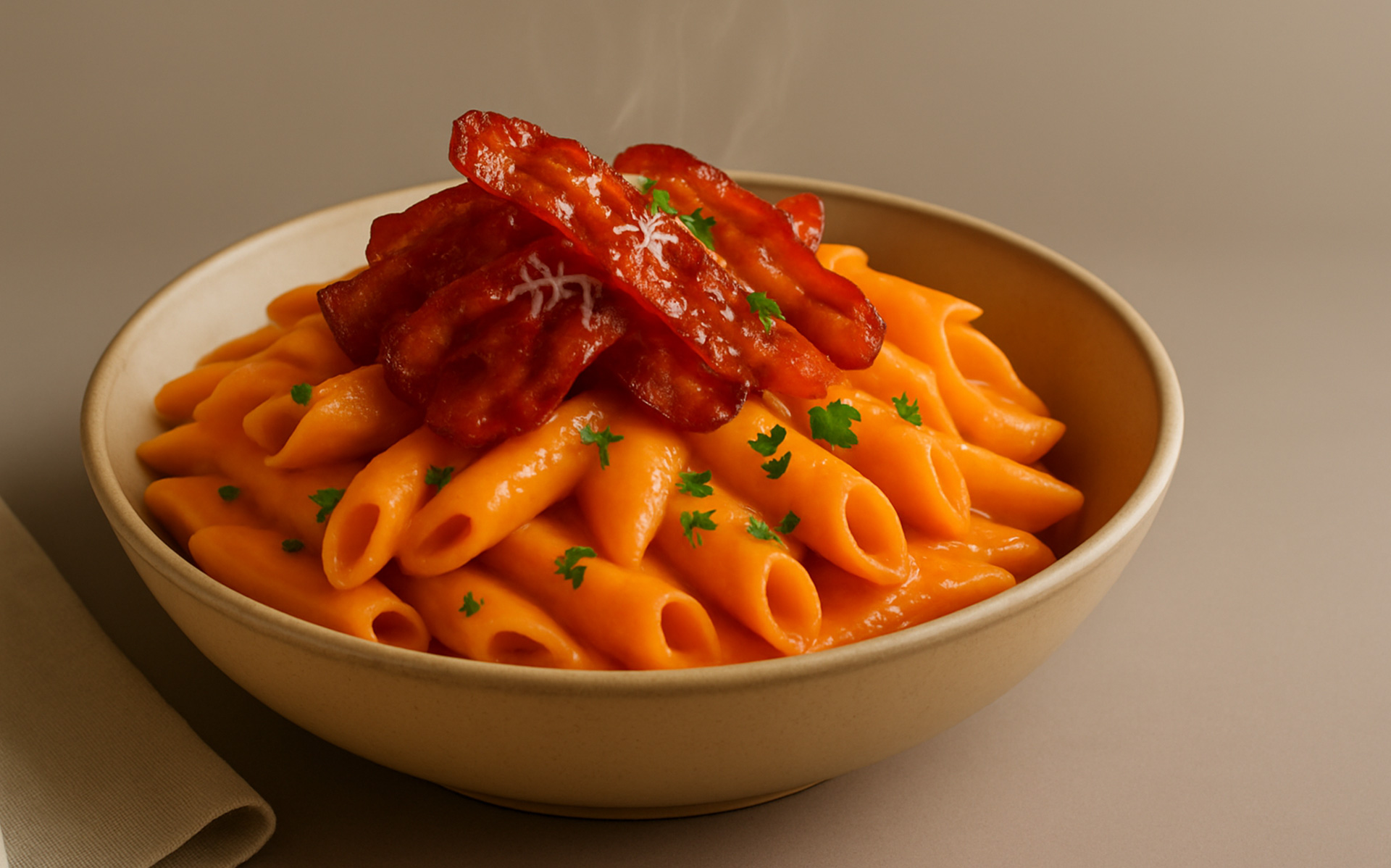 While the pasta cooks, heat a drizzle of oil in a large pan over medium-high heat. Add the bacon pieces and fry until nicely golden and starting to crisp up – about 5 minutes. That smoky smell is everything! 🥓