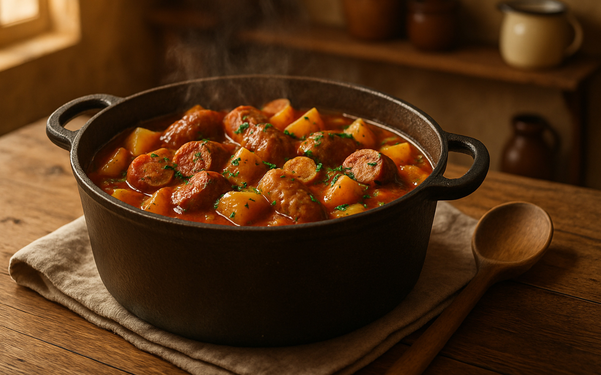 Return the browned bangers to the pot. Bring to a gentle boil, then reduce the heat, put the lid on, and simmer for 25–30 minutes – until the potatoes are soft and the sauce has thickened into a rich, hearty gravy.